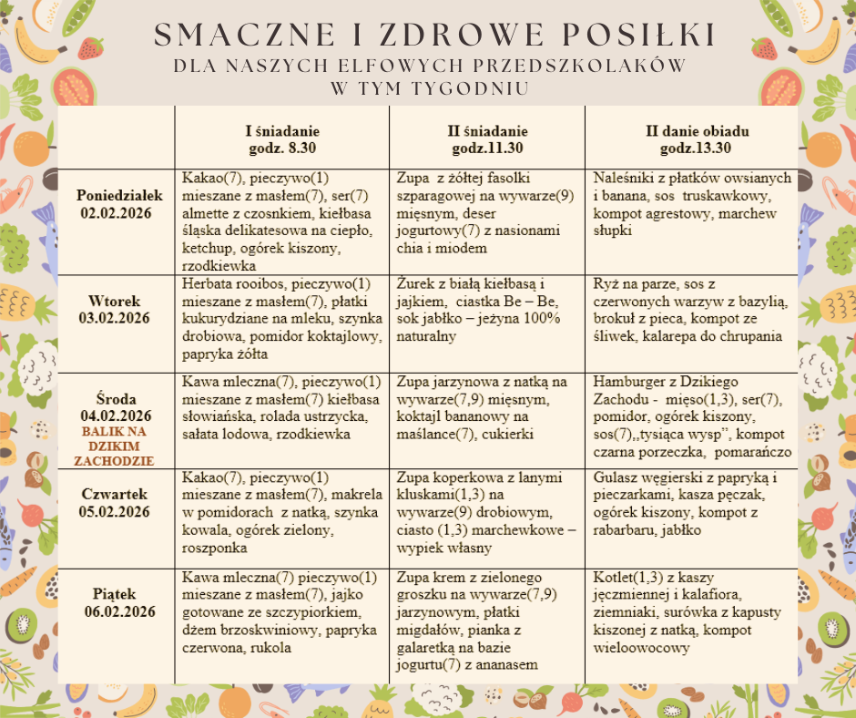 - Jadłospis 02.02 – 06.02I śniadanie godz. 8.30 II śniadanie godz.11.30 II danie obiadu godz.13.30 Poniedziałek 02.02.2026 Kakao(7), pieczywo(1) mieszane z masłem(7), ser(7) almette z czosnkiem, kiełbasa śląska delikatesowa na ciepło, ketchup, ogórek kiszony,… Dowiedz się więcej: Jadłospis 02.02 – 06.02