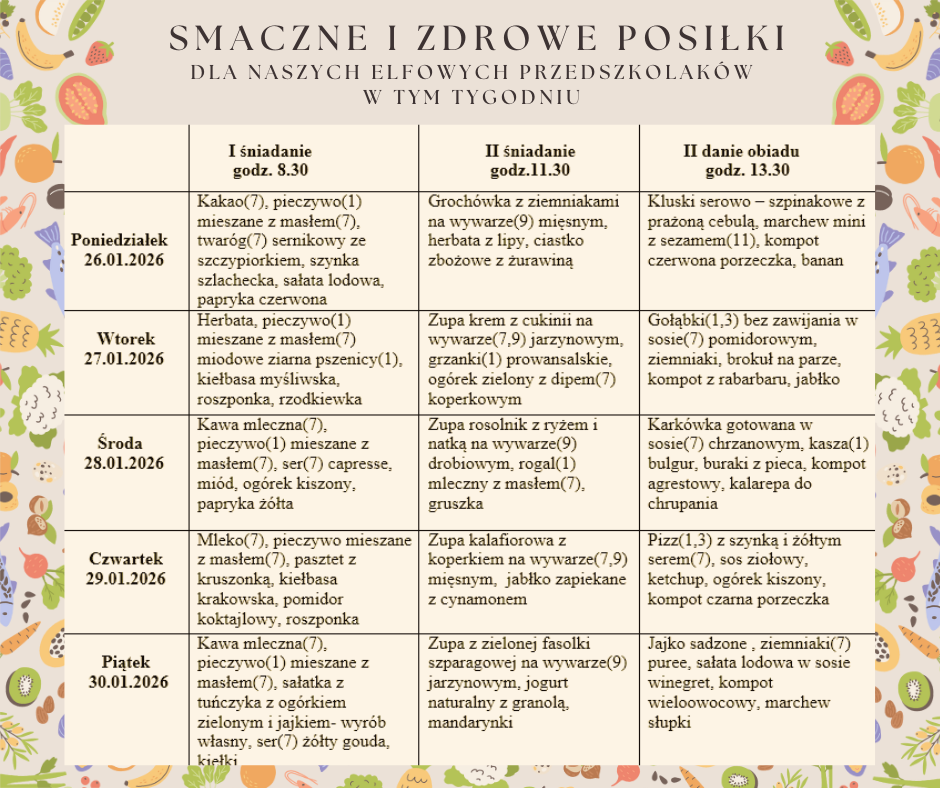 - Jadłospis 26.01 – 30.01I śniadanie godz. 8.30 II śniadanie godz.11.30 II danie obiadu godz. 13.30 Poniedziałek 26.01.2026 Kakao(7), pieczywo(1) mieszane z masłem(7), twaróg(7) sernikowy ze szczypiorkiem, szynka szlachecka, sałata lodowa, papryka czerwona Grochówka… Dowiedz się więcej: Jadłospis 26.01 – 30.01