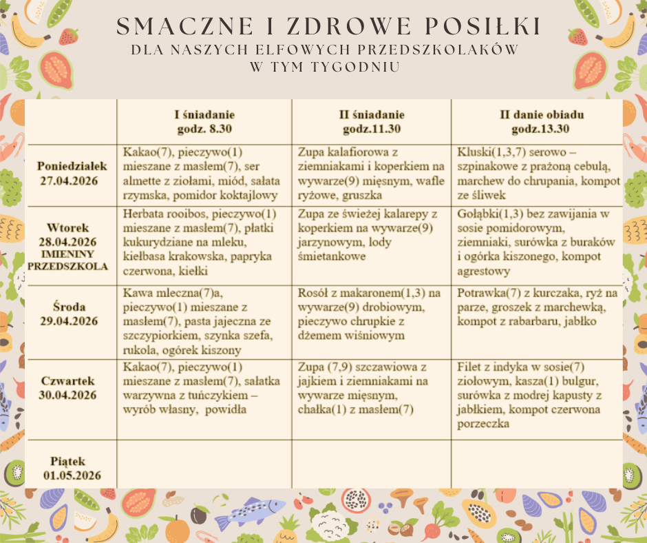- Jadłospis 27.04. – 1.05I śniadanie godz. 8.30 II śniadanie godz.11.30 II danie obiadu godz.13.30 Poniedziałek 27.04.2026 Kakao(7), pieczywo(1) mieszane z masłem(7), ser almette z ziołami, miód, sałata rzymska, pomidor koktajlowy Zupa kalafiorowa z… Dowiedz się więcej: Jadłospis 27.04. – 1.05